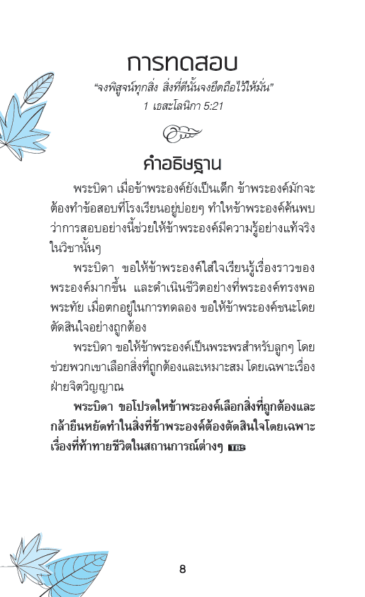 หนังสือเล่มนี้สอนวิธีการนำาพระคัมภีร์มาใช้ในชีวิตประจำาวัน ด้วยการนำาเสนอข้อความจากพระคัมภีร์ และคำาอธิษฐานที่สะท้อนความเข้าใจจากการอ่านพระคัมภีรืในแง่มุมต่างๆ เพื่อนำาผลดี ความสุข และความสำาเร็จมาสู่ชีวิตของผู้ปฏิบัติตาม เพราะเราเชื่อแน่ว่า “ผู้ใส่ใจพระ วจนะจะเจริญรุ่งเรือง และคนที่วางใจในพระยาห์เวห์จะสุขสบาย” (สุภาษิต 16:20) มีทั้งหมด 42 หัวเรื่องในเล่ม