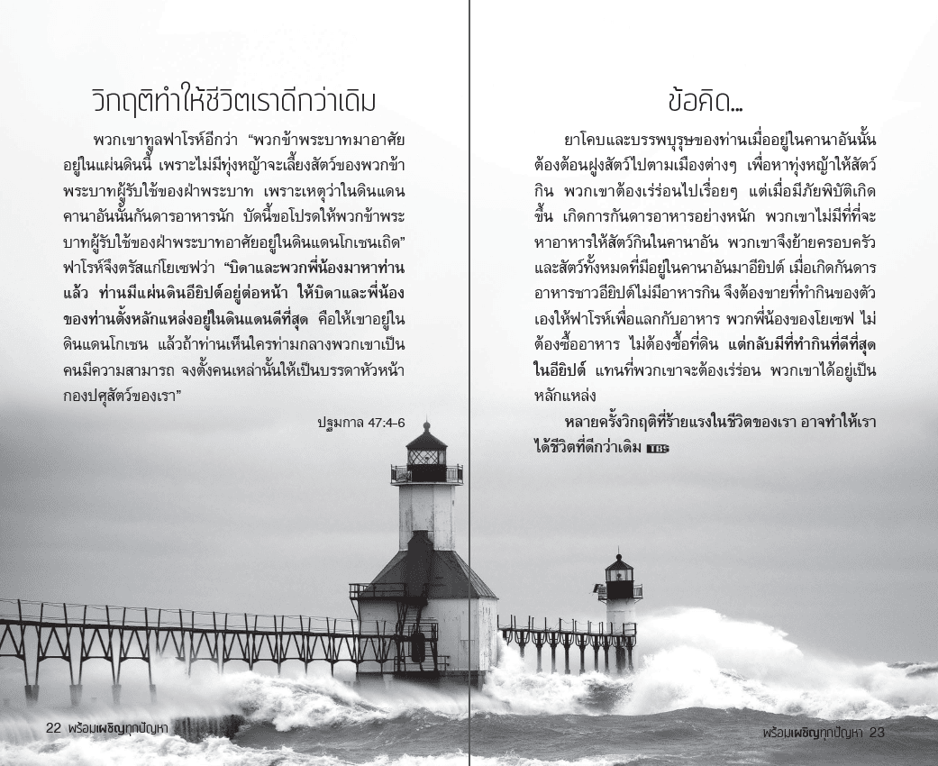 เผชิญปัญหาทุกวัน แต่ก็ยังแก้ไม่ตก ลองผิดลองถูก แต่ปัญหาก็ยังอยู่ หลายคนคิดว่าพระคัมภีร์เป็นเรื่องของศาสนา ไม่เกี่ยวข้องกับชีวิตประจำวัน หนังสือเล่มนี้ให้ข้อคิดเพื่อการเผชิญปัญหาโดยยกตัวอย่างบุคคลจริงในพระคัมภีร์ที่เผชิญปัญหาและรับการช่วยกู้จากพระเจ้า ท่านจะได้รับแรงบันดาลใจในการต่อสู้กับปัญหาของท่านจนได้รับชัยชนะ